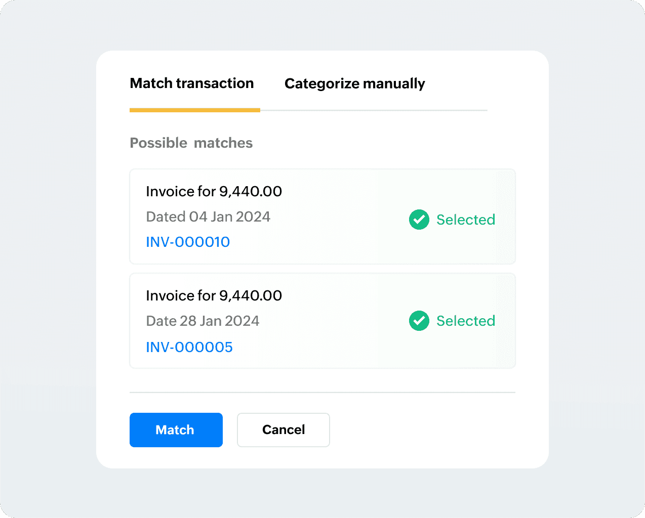 Received or made consolidated payments? Handling partial payments or installments? Fret not! Zoho Books lets you easily match multiple line items from both the bank feed and the transactions in Zoho Books.