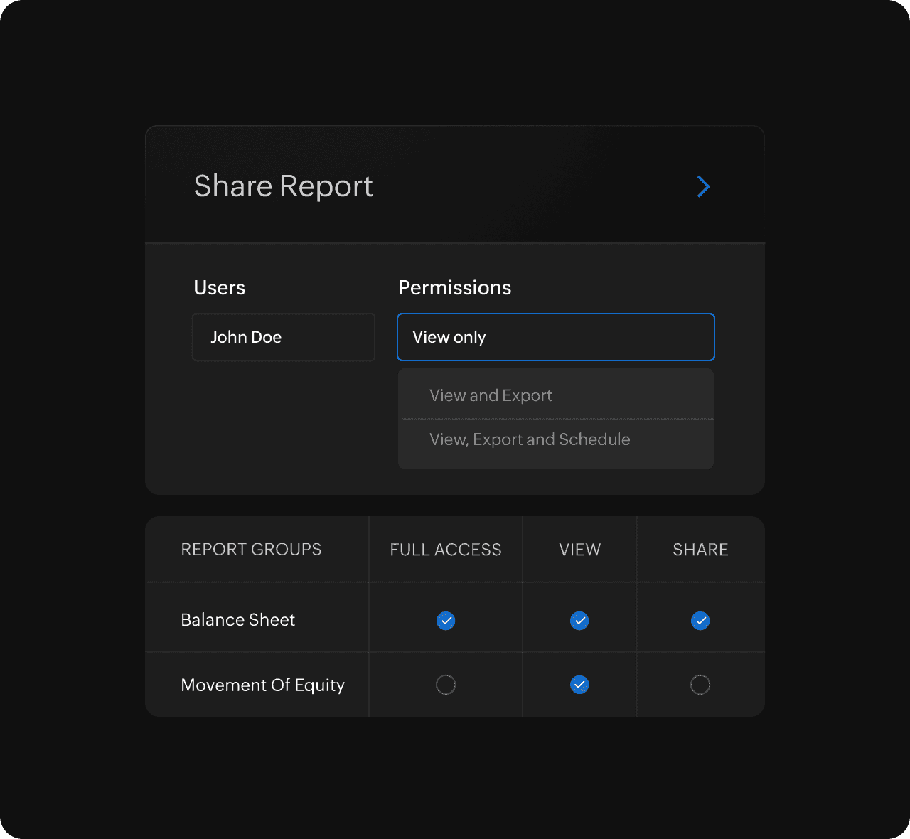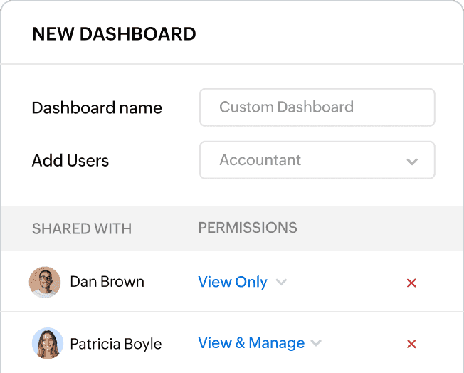 Keep control. Grant view or edit access to your custom dashboards for specific users. Foster collaboration while ensuring financial data security.