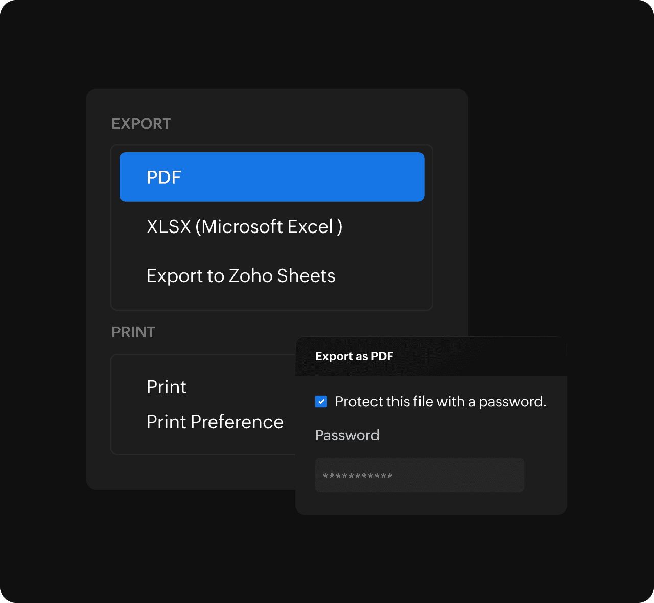 Export reports as PDFs or spreadsheets and email them directly. Put a password on any important files to keep them extra safe. Alternatively, create online, collaborative spreadsheets from your reports.